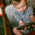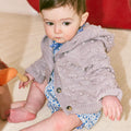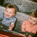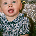 オーガニックピマコットン製の半袖ロンパース。メロー加工されたフリル襟と小さなリボンが特徴的。伸縮性のある丸袖も相まってとてもかわいい一着です。