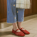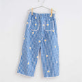 青系チェックをベースにお花を散らしたかわいらしいテイストのパンツ。