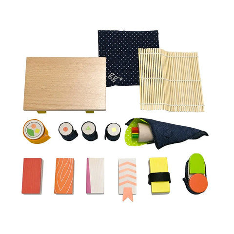 ネタとシャリはマグネットでくっつくので簡単ににぎって頂けます。 また、のりはこだわりのデニム製。巻きすを使ってコロコロ巻き寿司も作れます。 はさみでカットできる「わさびシート」とお土産包みにしたりハチマキにしたりできるドット柄風呂敷が付いています。