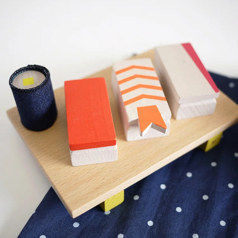 素材:シャリとネタ、寿司ゲタ(ヨーロッパ産のビーチ材)、のり(デニム)、風呂敷(コットン)