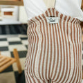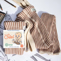 あたたかみのあるグラノーラとやさしいクリーム色のストライプが美しく調和した一枚。落ち着いたアースカラーは、普段のおしゃれにも取り入れやすく、どんなコーディネートにも自然に馴染みます。日常の中にそっと華やかさを添えてくれるデザインです。