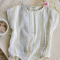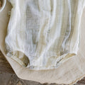 やわらかなニュアンスカラーが目を惹くロンパース。ナチュラルなグレーのストライプが魅力です。