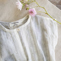 涼しげな薄手の生地なので、春夏の主役にぴったりの一枚。首元のボタンで大きく開閉するのでお着替えもスムーズに。股下もおむつ替えに配慮した仕様で、お世話が楽ちんです♪シンプルながらも上質な素材感で、贈り物としてもおすすめです。