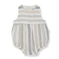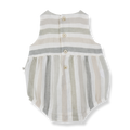 マルチカラーのストライプが織りなす、優しいニュアンスが特徴のロンパース。 ふんわり丸いバルーンシルエットが、赤ちゃんの動きに合わせて愛らしく揺れます。背中のボタン仕様で大きく開くためお着替えもスムーズ。後ろ姿を彩る大切なアクセントにも。 特別な夏の一枚に、いかがでしょうか?