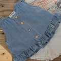 裾にあしらわれた控えめなフリルが、カジュアルな素材感の中に女の子らしい甘さを添えてくれます。フロントに並んだボタンが、ナチュラルで上品なアクセントに。砂浜やお庭での水遊び、夏の冒険にぴったりな、軽やかで洗練された一着です。