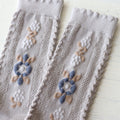 花模様と編み目が美しくオシャレなニーハイソックス。柔らかい肌触りの質感が特徴です。