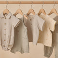 柔らかなコットン素材を使用したクラシックなシルエットで、折り返し襟、フロントのココナッツボタン、着替えが簡単な隠しスナップが特徴です。セージギンガムプリントも魅力的でエレガントなシーンにもぴったりのアイテムです。