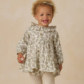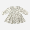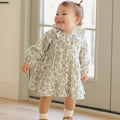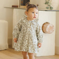 A dress made from organic cotton that is soft and gentle on the skin. The tiered, long sleeves, and frills around the neck are adorable and gorgeous. The snap button at the center front makes it easy to put on and take off. The baby size includes gathered bloomers.