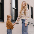 A cozy sweater with a crocheted collar, cable knit front and gathered puff sleeves.