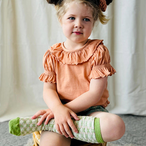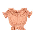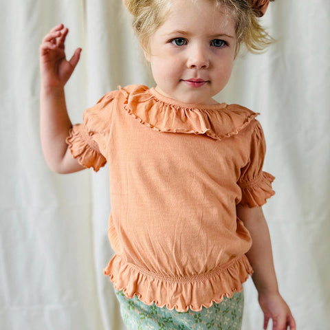 フリルの襟が愛らしい。袖と裾にシャーリングを施した甘いフォルムのトップス。ナチュラルな風合いに美しい発色が魅力の一枚。