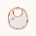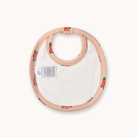 愛らしいローズカラーに上品なカメリアの花柄が美しく、華やかさを添えた魅力的なデザイン。赤ちゃんの愛らしさを引き立てます。スナップボタンで着脱も簡単です。